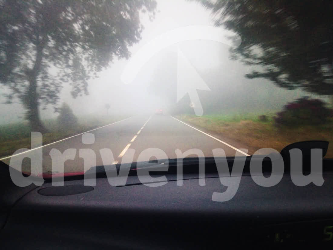 12. Si su motocicleta lleva enganchado un remolque, ¿puede circular por la carretera con niebla que se observa en la fotografía?.